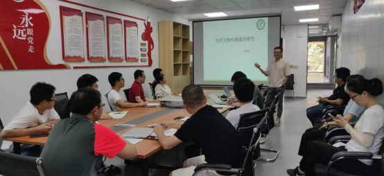 首先,陈晓涌博士做了题为《光纤生物传感器的研究》的学术报告,他介绍了光纤生物传感器的基本原理、发展历程及未来的发展需求,并详细讲述了其在倾斜光纤光栅生物传感器上所取得的研究进展,以及应用于蛋白、生物小分子、铵离子及血糖等方面的探测。
