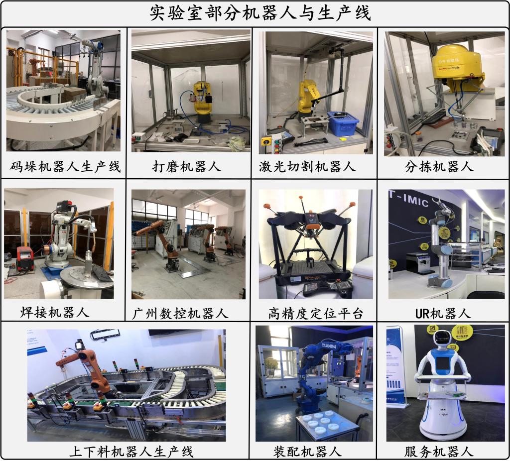 1.校内平台:课题组隶属于广东省先进自动化工程技术研发中心和工业机器人重点实验室、广东省高校嵌入式与测量系统工程技术开发中心,实验条件和场地优良、各种资源丰富。课题组已拥有所需要的各种系统设计、分析和测试软件,包括AutoCAD、Pro/E、SolidWorks、UG、ADAMS、ANSYS、LabVIEW、MatLab、ROBOTCAD等专业软件工具,提供了良好的软件条件。智能机器人实验室和先进工业机器人实验室拥有加工中心一台、安川Motoman机器人一台、广州数控工业机器人6台、ABB1410两台及搬运、码垛、上下料集成应用方案一套,发那科的机器人4台及切割、分捡、打磨集成应用方案各一套,Kuka的Youbot移动操作臂一台、丹麦的模块化UR机器人一台、自行研制的并联机器人及传送系统一套、SCARA机器人两台、多种机器人模块(包括关节模块和末端功能模块)和模块化机器人系统、U盘仿真机器人生产线一条,如图1-2所示。