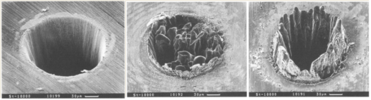 图1. 飞秒、皮秒和纳秒激光脉冲在金属薄片上烧蚀钻孔的电镜图。脉冲波长均为780nm 。其中左图:200fs, 120 mJ, 0.5J/cm2; 中图:80ps, 900 mJ, 3.7J/cm2;右图:3.3ns, 1 mJ, 4.2 J/cm2。