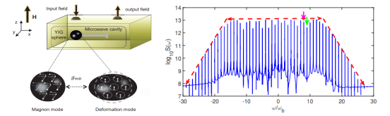 腔-磁力系统近年来成为了快速发展的研究领域,为观察许多有趣的经典和量子现象提供了一个特殊的平台。磁力系统是利用铁磁晶体中机械振子自由度和磁振子相互耦合(即磁致伸缩效应)来研究磁振子学领域中许多不同非线性问题的一个独特平台,其中机械振子与磁振子之间的耦合可以用辐射压力类型的耦合相互作用来表示,这跟腔-光力系统中机械振子和光子耦合形式是类似的,所以说磁力系统是一种广义的光力系统。磁振子频率梳(一种特殊的高阶边带谱)是自旋波领域与光学频率梳的直接类比,近年来因其在高精度磁振子频率测量中的潜在应用而受到广泛关注。然而,由于磁振子之间的非线性相互作用较弱,在低功率驱动下很难产生超宽带的磁振子频率梳。为了有效解决这一问题,本研究提出了一种在磁力系统中通过双色微波驱动产生超宽带磁振子频率梳的有效方案。