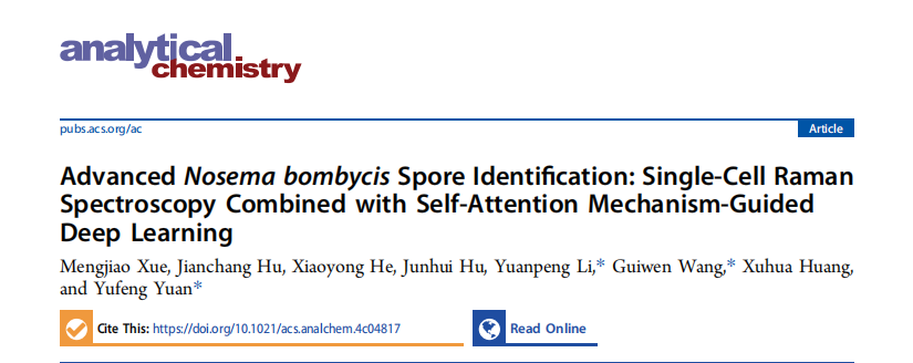 近日,我院袁玉峰研究员团队在在美国ACS旗下分析化学领域顶级期刊《Analytical chemistry》发表题为“Advanced Nosema bombycis Spore Identification: Single-Cell Raman Spectroscopy Combined with Self-Attention Mechanism-Guided Deep Learning”的研究论文。该成果以东莞理工学院为第一完成单位,袁玉峰研究员联培硕士生薛梦娇为论文第一作者,袁教授与广西科学院王桂文研究员、广西师范大学黎远鹏副教授为论文共同通讯作者。
