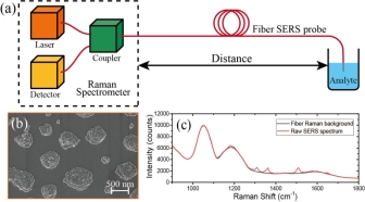 图1、(a)利用光纤SERS探针开展远程SERS光谱检测示意图,(b)光纤SERS探针表面的纳米颗粒团簇结构,(c)光纤自身拉曼对待测物SERS光谱的影响。