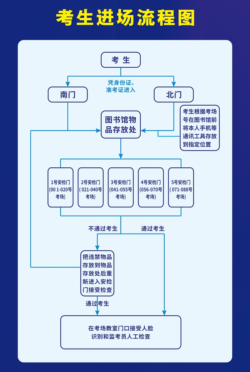 3.每场考试开始前,监考人员对所有进入考场的考生进行核验身份证、准考证考生进入考场内须通过人脸识别通道,与考试无关物品需放置在考场外