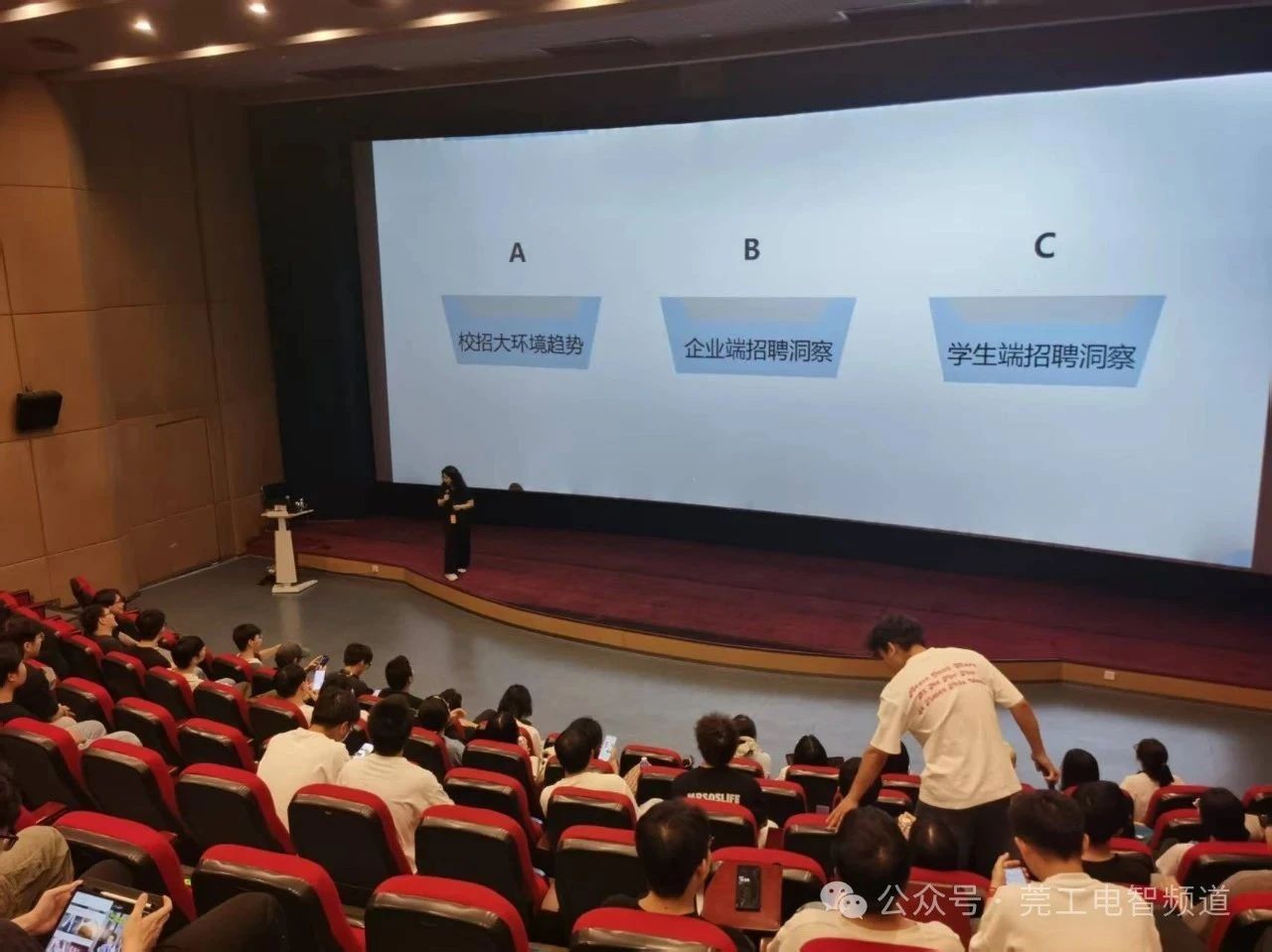 接着是公司的宣讲会就业指导环节,视源股份的HR王小姐从校招大环境趋势、企业端招聘洞察、学生端求职洞察三个方面,立足行业各项数据分析,详细阐述了不同行业的发展前景,分析了企业的人才需求以及应聘所需的技能要求,为同学们指明了就业方向。她还指出,有时候顺应趋势不一定完全正确,深刻洞察自己,辩证思考自己想要什么,什么适合自己才最重要。