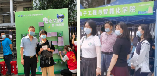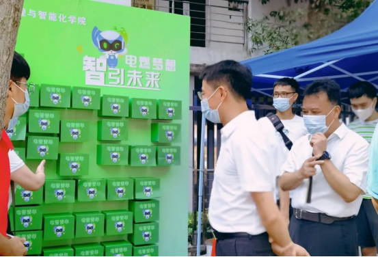 校党委书记成洪波,校党委副书记、校长马宏伟等一行来到迎新点,悉心询问报到工作,领导们在电智迎新墙前了解电智启程盒。
