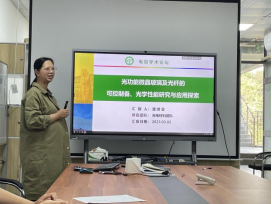报告会上,潘绮雯博士分享了题为《光功能微晶玻璃及光纤的可控制备、光学性能研究及应用探索》的研究工作。她首先介绍了光纤激光玻璃材料的发展瓶颈,并指出光功能微晶玻璃是发展新波段、可调谐光纤器件的重要突破口,接着围绕“自上而下”及“自上而下”法制备的光功能微晶玻璃展开了系统的讨论,分享了自己在光功能微晶玻璃的制备、光学性能研究以及应用探索等方面的研究进展。
